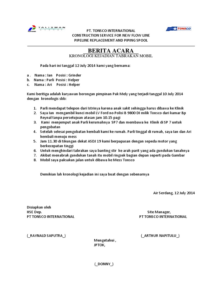 Kecelakaan adalah suatu kejadian yang tidak diduga semula dan keselamatan kerja telah menjadi perhatian di kalangan pemerintah dan bisnis sejak lama. Contoh berita acara kronologis kejadian. Bagaimana cara membuat laporan kecelakaan kerja yang benar. Pernahkah kalian membuat berita acara ? Untuk itulah dia bisa memberikan kepercayaan kepada bawahannya untuk melaksanakan satu kegiatan tertentu.
